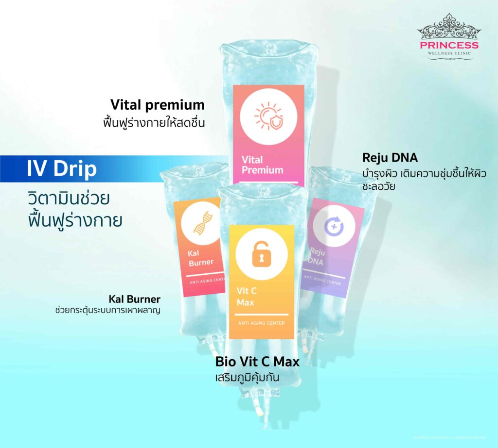 โปรแกรม IV DRIP ของ PRINCESS WELLNESS CLINIC มีสูตรให้เลือกหลากหลายตามความต้องการ เช่น: